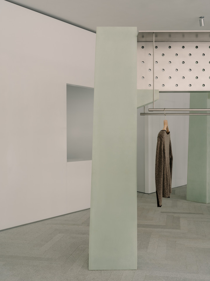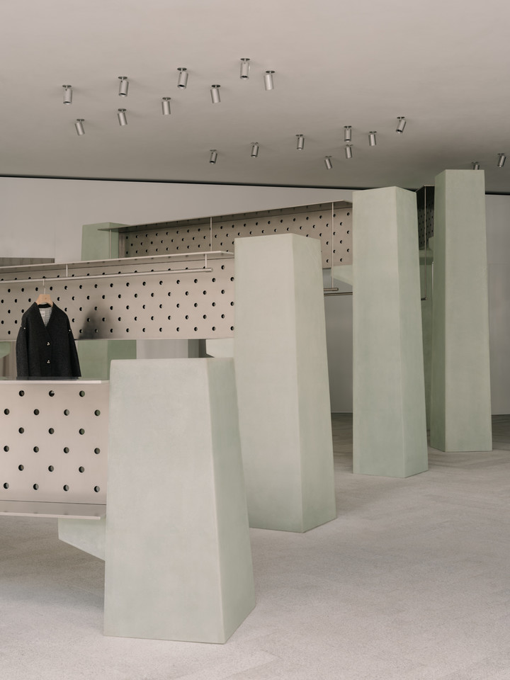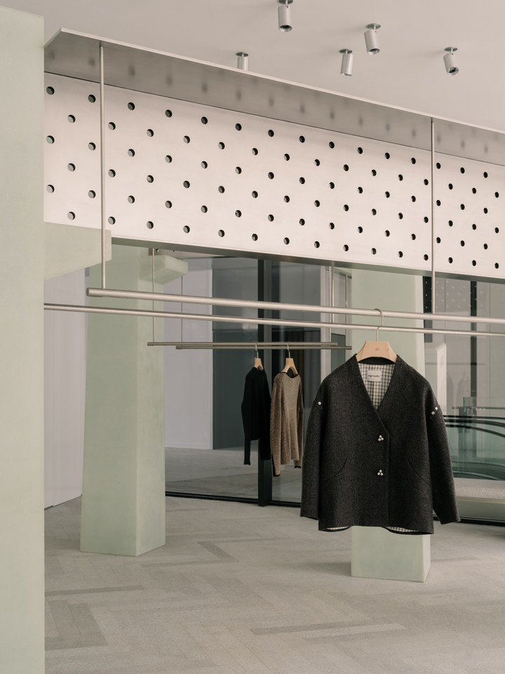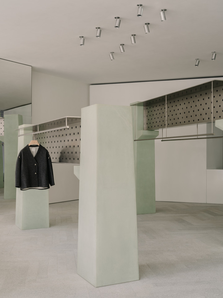 两者通过刻意裸露的螺栓进行连接,坦率展露“建造”的痕迹。这种由结构直译而来的“包裹的精致”与“裸露的坚韧”, 恰是sage服装美学与当代女性气质最贴切的空间转译。