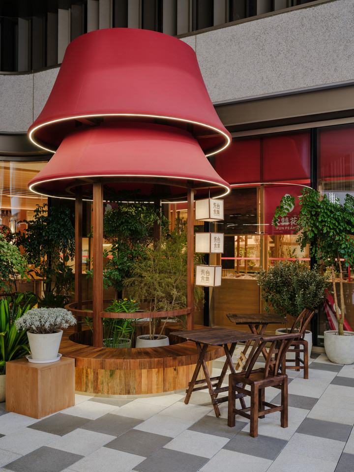 This lively spirit of memory and everyday life ultimately crystallizes into tangible, touchable detail. Weathered timber commonly found in the Dongtaili market is reinterpreted into three distinct modular elements: vertical racks for displaying dishes, flexible seating stools, and planters for greenery.