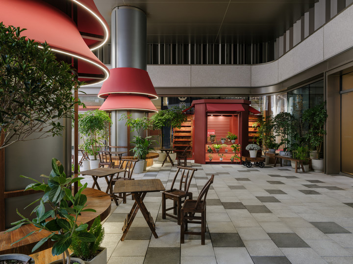 The design language of “Street Collage” is further articulated through the reinterpretation of existing market elements and the cultivation of a diverse brand ecosystem. Blue vintage awnings are simplified into lightweight red contemporary canopies, activating spatial memory through vibrant color while allowing material variants to respond to different tenants.