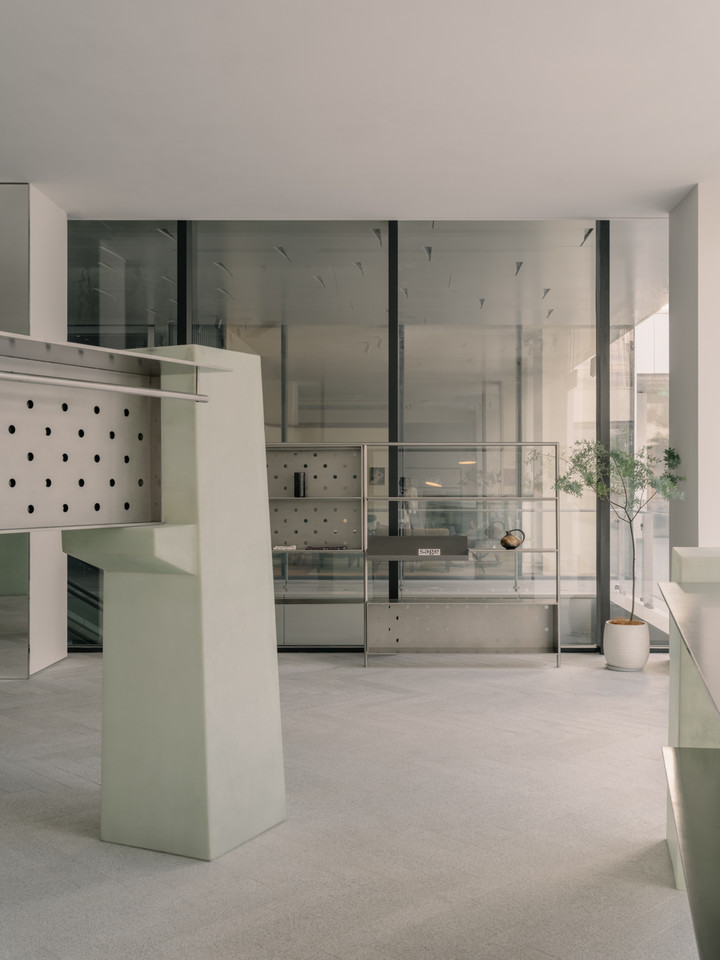 The floor-to-ceiling window opens the space, inviting natural light and the greenery of the streetscape indoors. The spatial narrative unfolds along a curving wall that flows with ease, like a tranquil stream, dividing left and right zones, while connecting front and back. Its smooth surface captures shifting light and shadow, guiding visitors’ steps through the space.