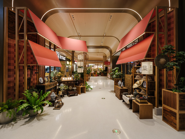 “拼贴”的设计思维,进一步落位于对原有市集元素的转化与品牌生态的构建。蓝色老式雨棚被简化为结构轻盈的红色现代雨棚,以明快色彩激活空间记忆,材质可根据店铺性质更换;原本粗朴的木框,以柚木、榆木等材质重新制作,在精细中留存手作温度。