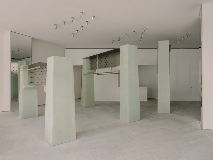 The interior is divided into two zones: the front zone, which serves as an open ‘Urban Dock’ dedicated to garment display and experience, and the rear zone. The rear zone serves as a functional ‘Support Hull’. The programs like fitting rooms, checkout counter and storage are incorporated into a white wall, while the wall delineates the front and rear zones.