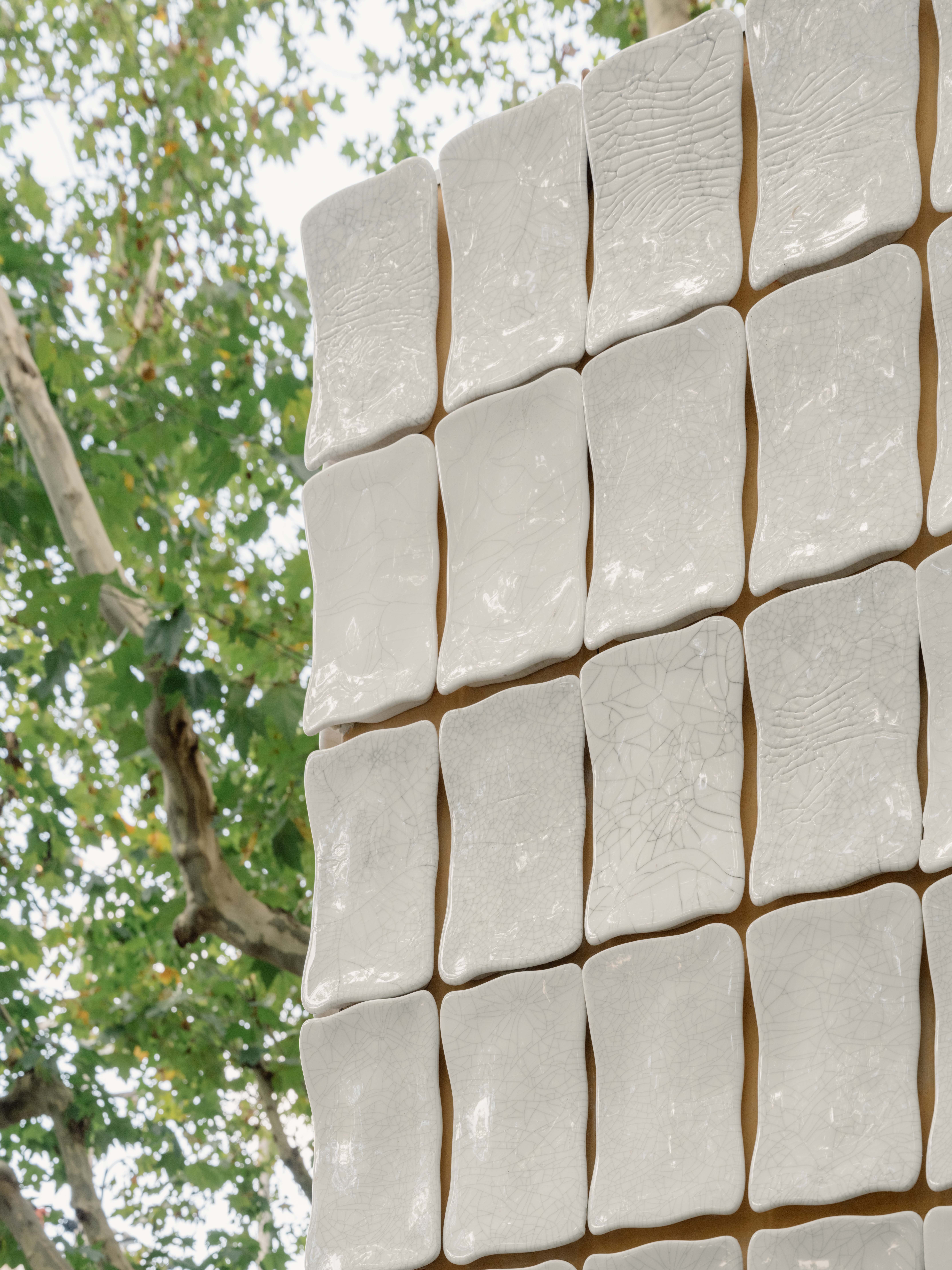外立面覆满定制的冰裂纹瓷片。其纹路灵感源自树木表皮剥落的纹理,经设计的简化,拓印在瓷片上,墨线填充每片独一无二的纹理,自然生长的痕迹写满整个入口,缓缓展开与树的对话。