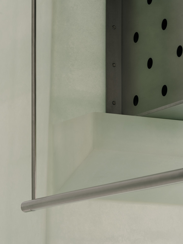 On the right side of the front area, a resting place is provided. Clothing pieces are arranged between black rods and transparent glass panels with a sense of lightness and order.